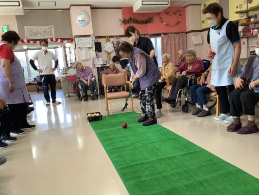園内遠足で外でグランドゴルフを計画していましたが天気が怪しく室内でスカットボール大会を行いました。